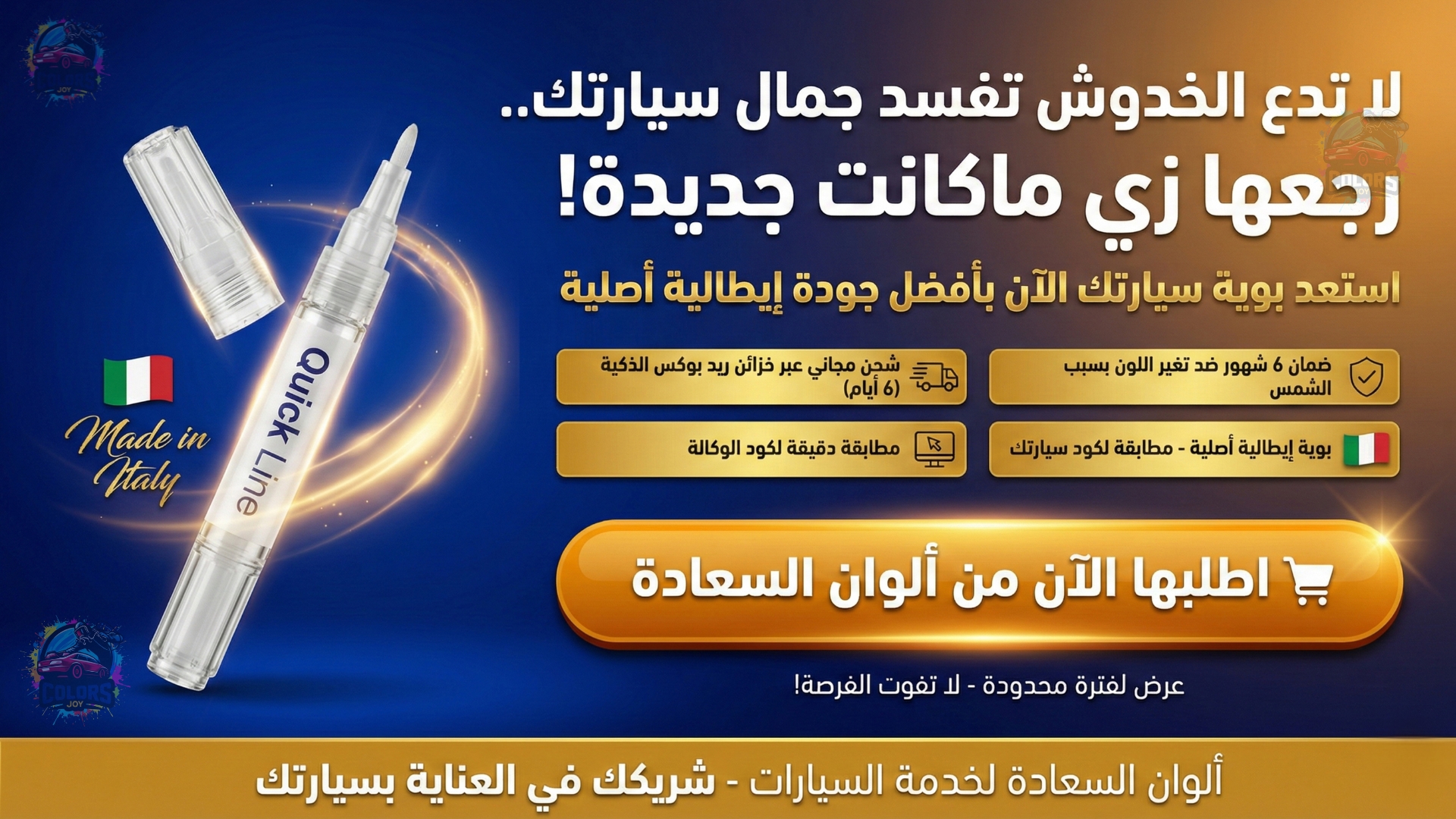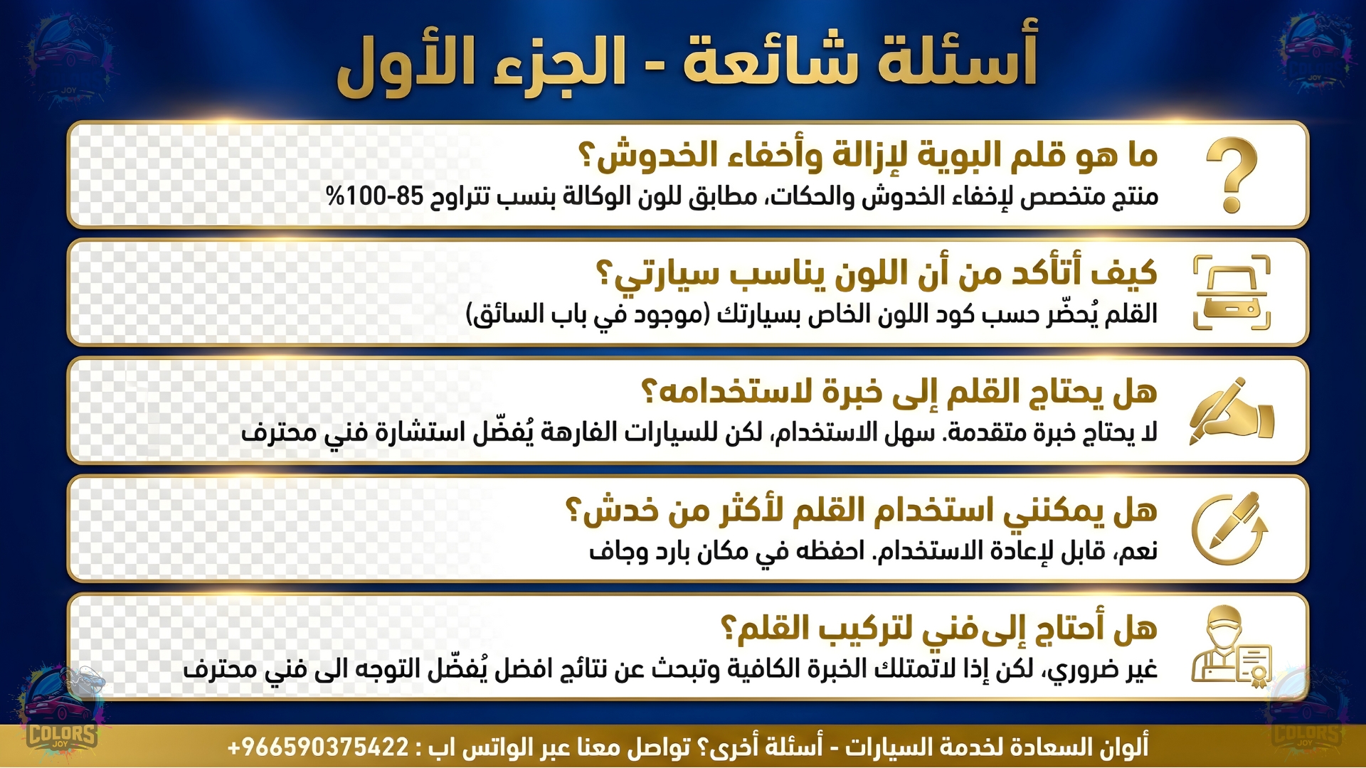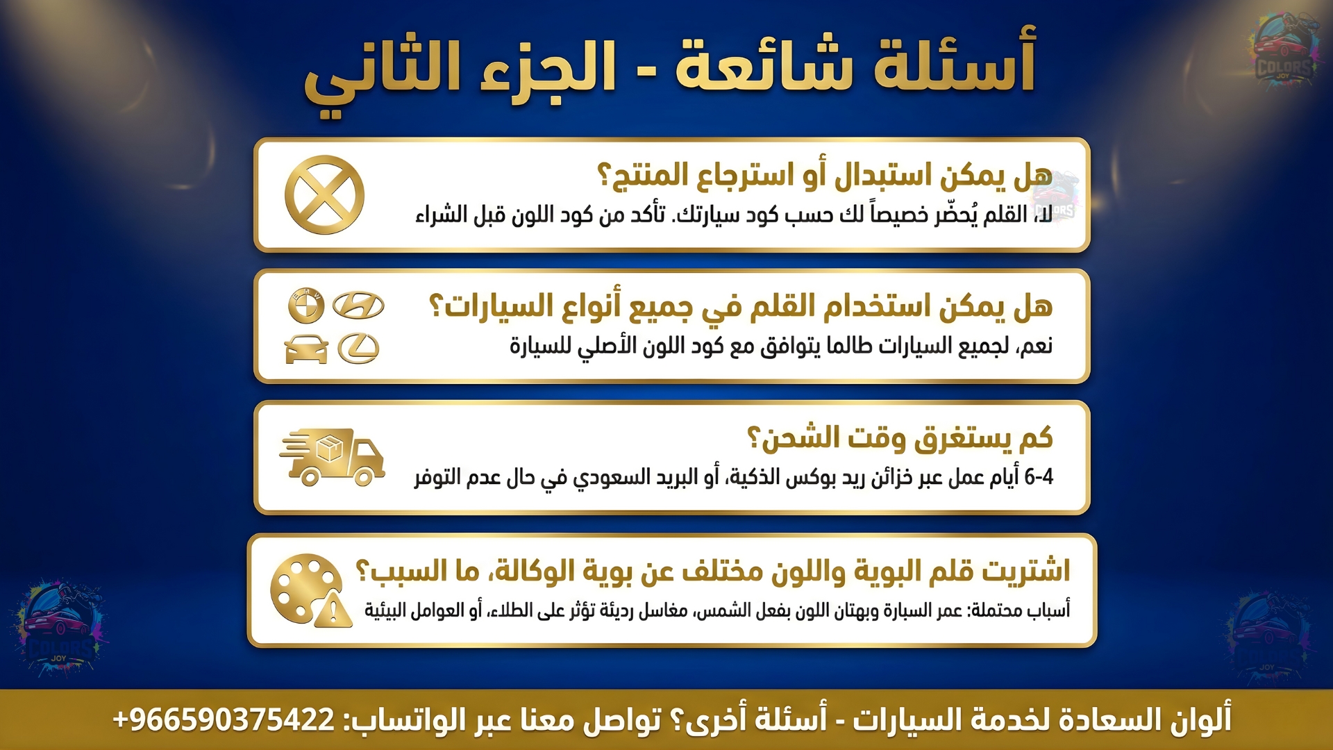 📌 لضمان حقك في التعويض: احتفظ بالقلم وأبلغنا فورًا في حال حدوث أي تغير غير طبيعي في اللون على السيارة.