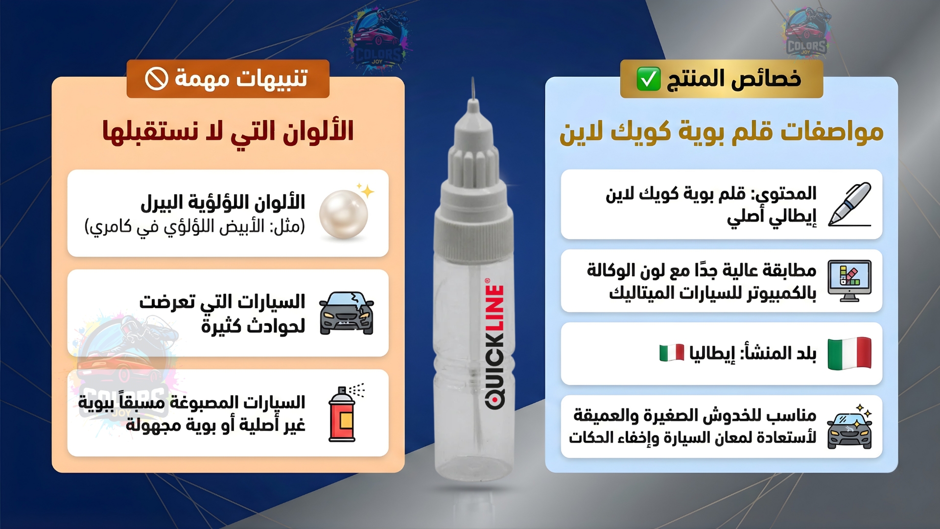 يأتي قلم بوية كويك لاين مع ضمان لمدة 6 أشهر ضد تغير اللون على السيارة بسبب التعرض لأشعة الشمس بشرط الاستخدام الصحيح.